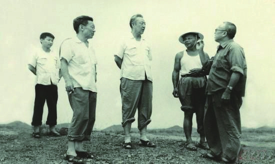 Xi Zhongxun (third from left) inspects a rural area in the city of Huiyang, South China's Guangdong Province, in August 1978. Xi Jinping (first left), then a Tsinghua University student, traveled to the countryside with his father during summer vacation.