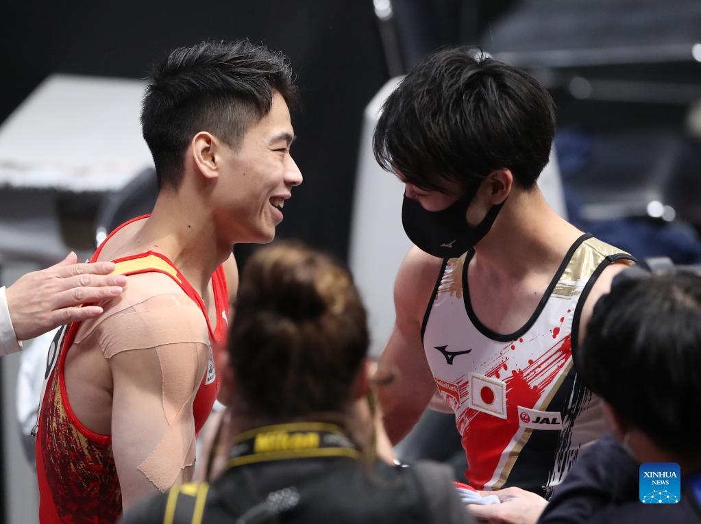 Hu Xuwei (L) of China reacts with Uchimura Kohei of Japan after the men's horizontal bar final at the 50th FIG Artistic Gymnastics World Championships in Kitakyushu, Japan, Oct. 24, 2021. (Xinhua/Du Xiaoyi)
