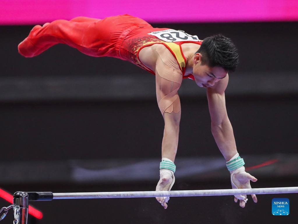 Hu Xuwei of China competes during the men's horizontal bar final at the 50th FIG Artistic Gymnastics World Championships in Kitakyushu, Japan, Oct. 24, 2021. (Xinhua/Du Xiaoyi)