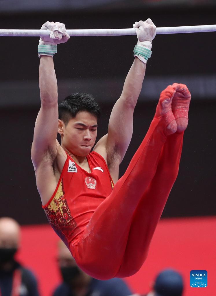Hu Xuwei of China competes during the men's horizontal bar final at the 50th FIG Artistic Gymnastics World Championships in Kitakyushu, Japan, Oct. 24, 2021. (Xinhua/Du Xiaoyi)