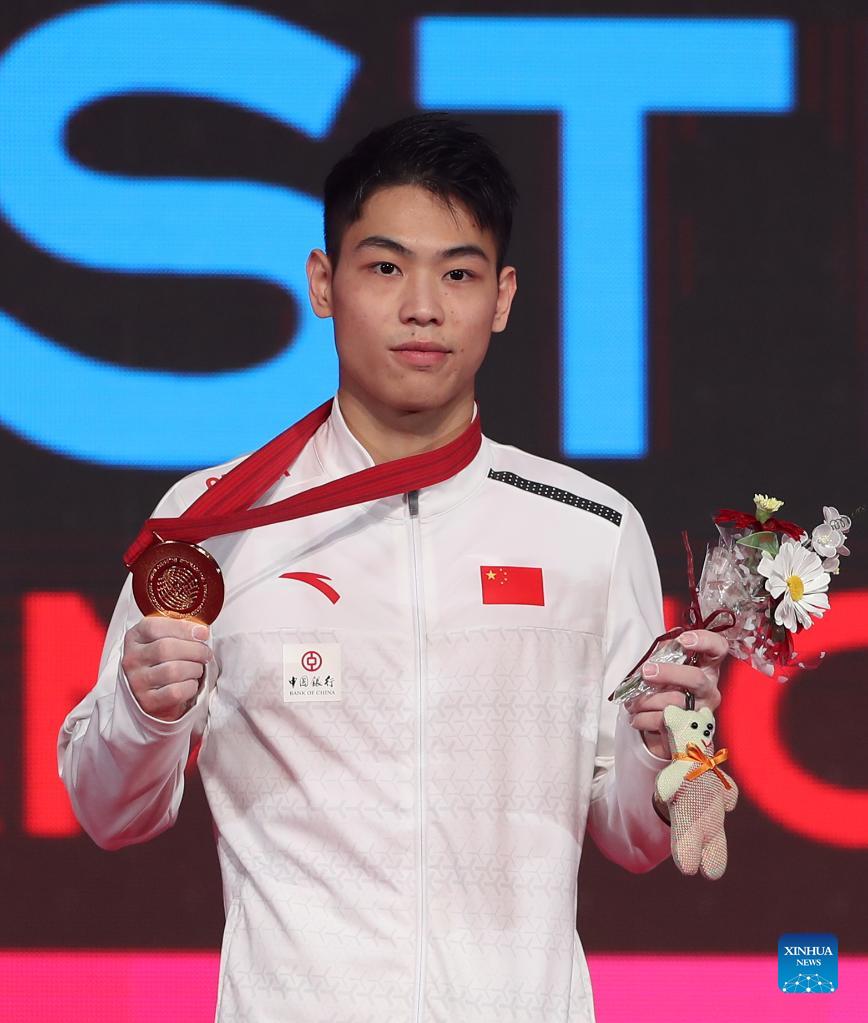 Hu Xuwei of China attends the awarding ceremony of the men's horizontal bar final at the 50th FIG Artistic Gymnastics World Championships in Kitakyushu, Japan, Oct. 24, 2021. (Xinhua/Du Xiaoyi)