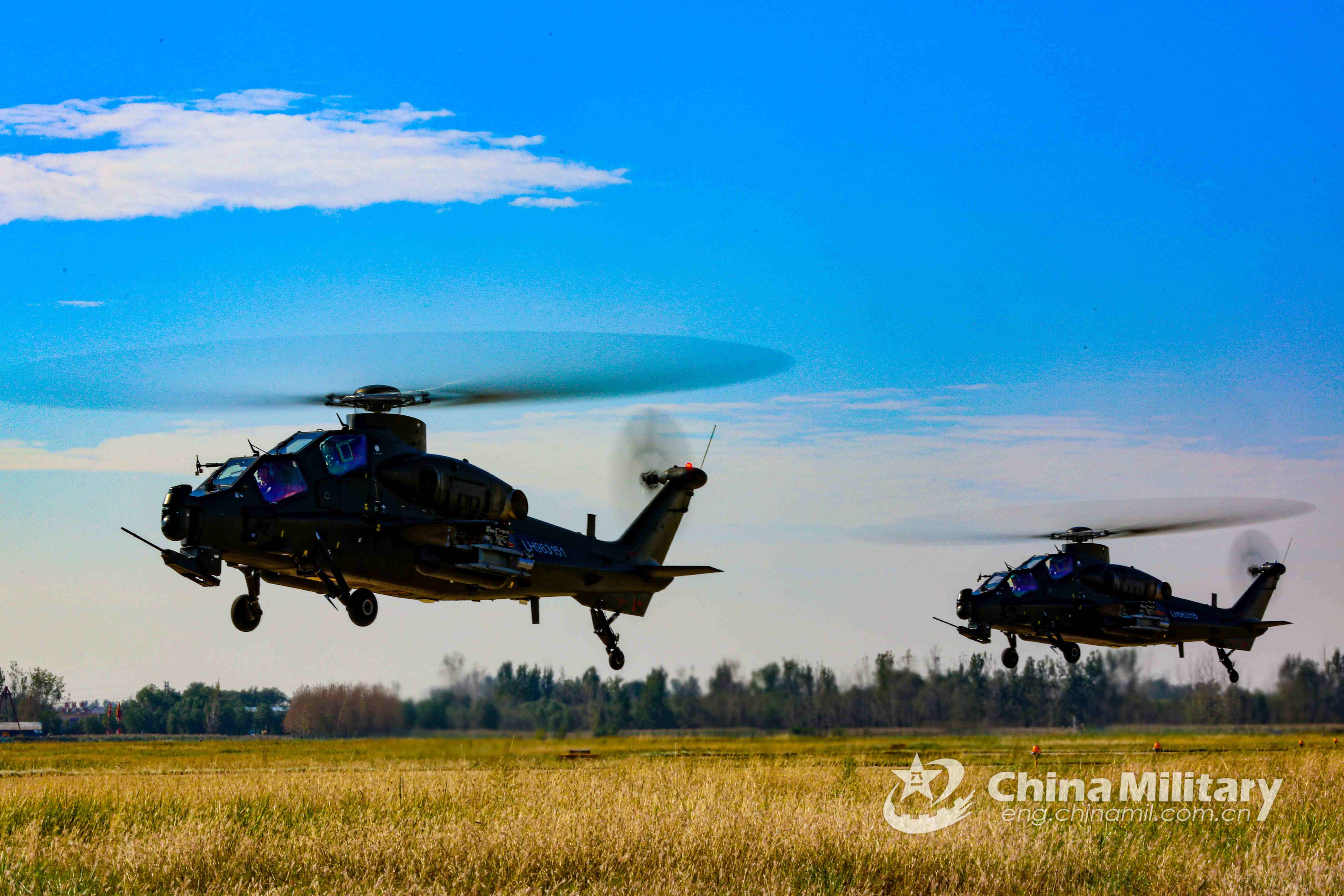 Two helicopters attached to an army aviation brigade under the PLA 80th Group Army hover above the grassland during a flight training exercise aiming to hone the troops' combat capabilities on October 12, 2021. (eng.chinamil.com.cn/Photo by Li Peng)
