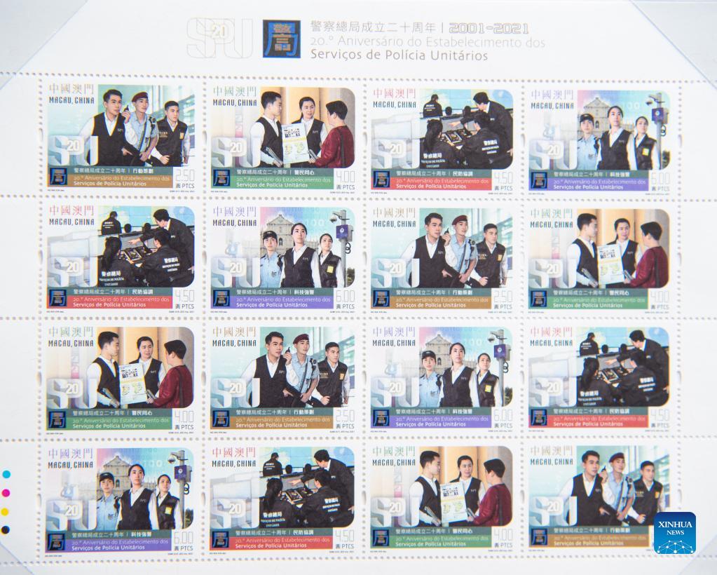 Photo taken on Oct. 25, 2021 shows the special stamps to mark the 20th anniversary of the Unitary Police Service, in south China's Macao. The Macao Post would issue souvenir stamps to mark the 150th anniversary of the Kiang Wu Hospital Charitable Association on Oct. 28, the 20th anniversary of the Unitary Police Service on Oct. 29 and the 20th anniversary of Macao Customs Service on Nov. 1. (Xinhua/Cheong Kam Ka)