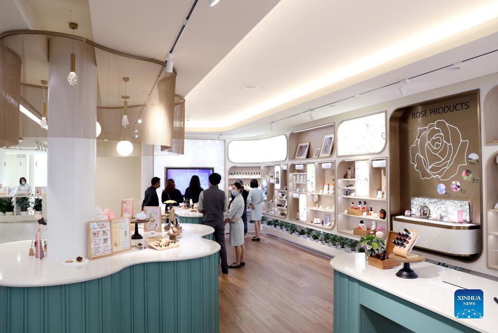 People visit the flagship shop of essential oil brand doTERRA in east China's Shanghai, Oct. 22, 2021. The U.S. essential oil brand doTERRA, a three time participant in the China International Import Expo (CIIE) since 2018, is growing rapidly in China market after its appearance in the CIIE as its launch pad. Boasting a workforce of more than 200 employees, doTERRA is running a factory, a laboratory, and a flagship shop in Shanghai, and its products have attracted a good number of loyal consumers across the country. (Xinhua/Liu Ying)