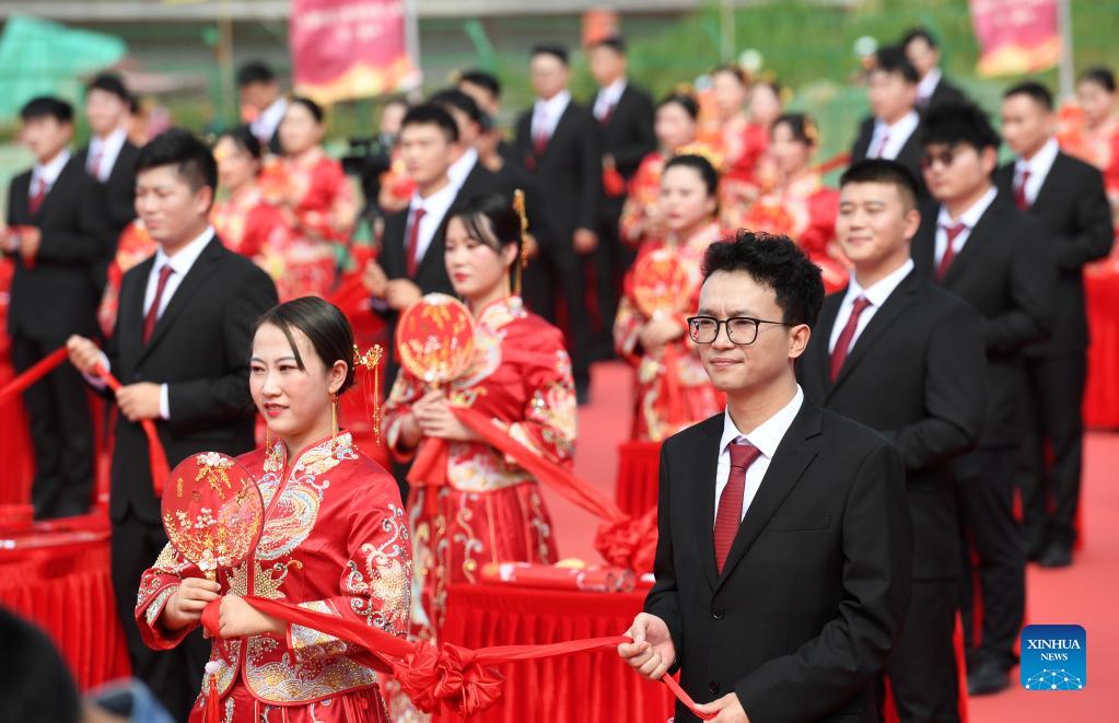 Couples attend a group wedding at an express railway construction site in Nanning, south China's Guangxi Zhuang Autonomous Region, Oct. 25, 2021. Sixty-four couples, all of them first-line staff members of the China Railway Shanghai Bureau Group Co., Ltd., attended their group wedding in a reformed traditional style here on Monday. (Xinhua/Lu Boan)
