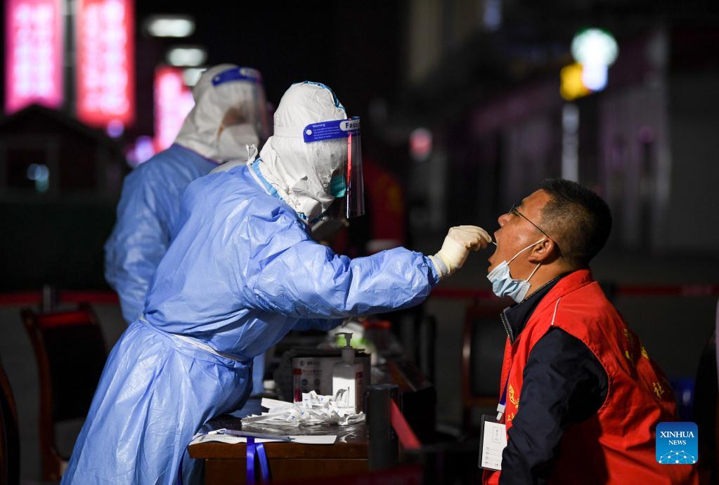 Medical workers take swab samples for nucleic acid testing at a sampling site during the latest COVID-19 outbreak in Yinchuan, northwest China's Ningxia Hui Autonomous Region, Oct. 23, 2021. Thousands of medical workers are on duty around the clock at more than 500 sampling sites in key districts of Yinchuan to conduct the test. (Xinhua/Feng Kaihua)
