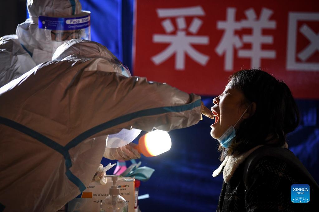 Medical workers take swab samples for nucleic acid testing at a sampling site during the latest COVID-19 outbreak in Yinchuan, northwest China's Ningxia Hui Autonomous Region, Oct. 23, 2021. Thousands of medical workers are on duty around the clock at more than 500 sampling sites in key districts of Yinchuan to conduct the test. (Xinhua/Feng Kaihua)