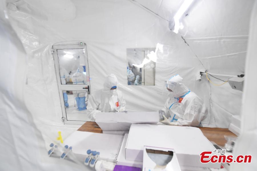 Medical workers conduct nucleic acid testing for COVID-19 at a "Falcon" air-inflated testing lab in Lanzhou, northwest China's Gansu Province, Oct. 25, 2021. (Photo: China News Service/Yang Yanmin)