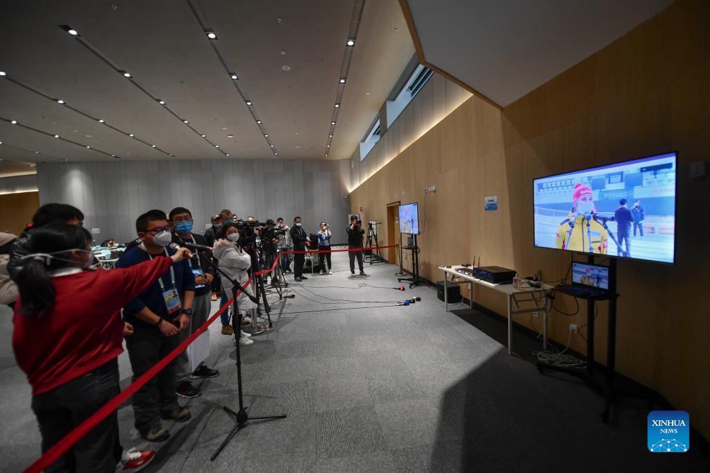 Journalists interviews the athlete online during a skeleton test event for the Beijing 2022 Olympic Winter Games at the National Sliding Center in Yanqing Zone, Beijing, capital of China, Oct. 25, 2021. (Xinhua/He Changshan)