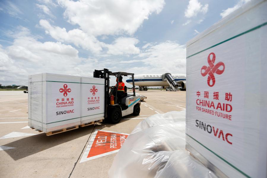 An airport worker transports packages of Sinovac COVID-19 vaccine at Phnom Penh International Airport in Phnom Penh, Cambodia, on Oct. 14, 2021. (Photo by Phearum/Xinhua)