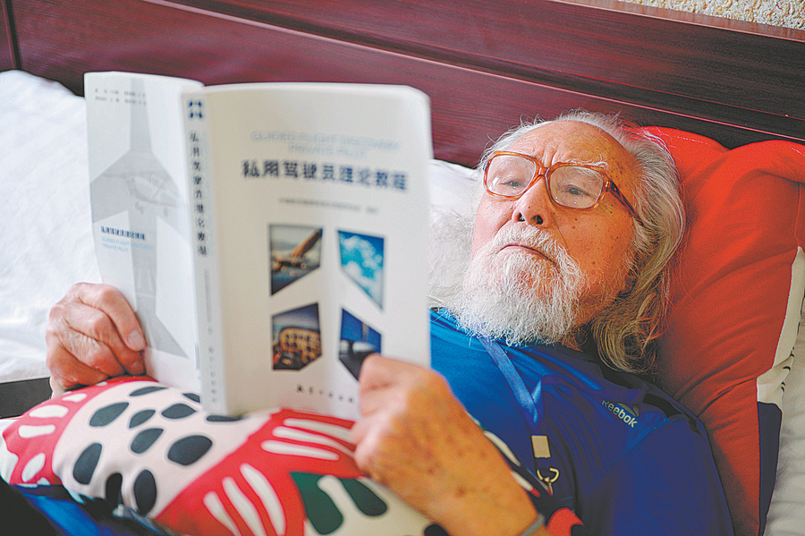Wang learns flight theories at the dormitory of the pilot school on July 10. WANG WEI/CCTV