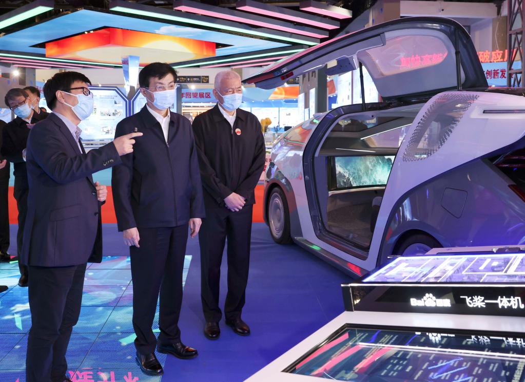 Wang Huning, a member of the Standing Committee of the Political Bureau of the Communist Party of China (CPC) Central Committee and a member of the Secretariat of the CPC Central Committee, visits an exhibition of China's achievements in scientific and technological innovation during the 13th Five-Year Plan period (2016-2020) in Beijing, capital of China, Oct. 26, 2021. (Xinhua/Liu Weibing)