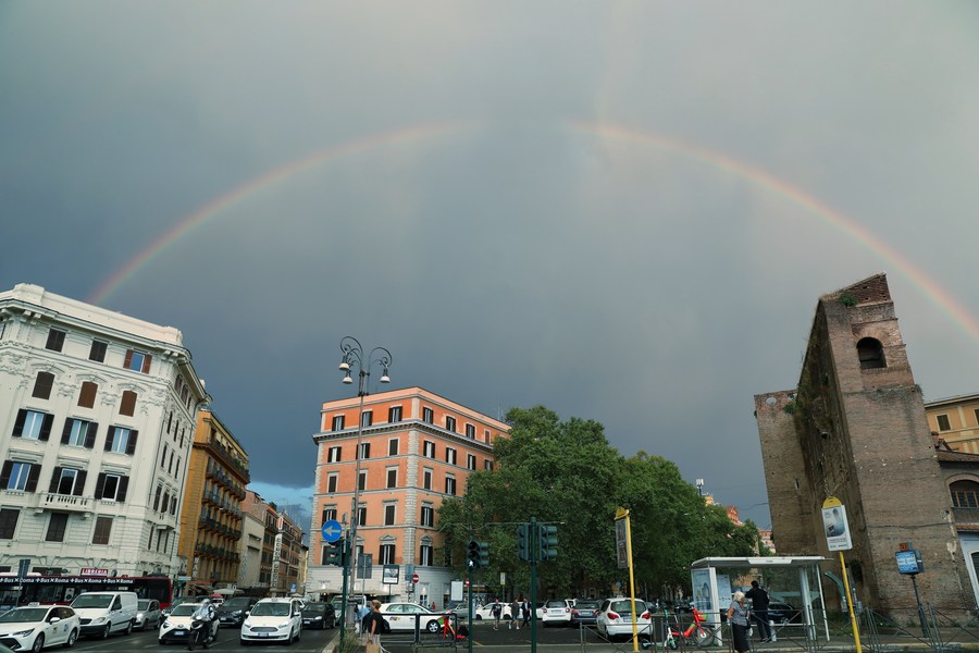 Photo taken on Sept. 8, 2021 shows a rainbow over the city in Rome, Italy. (Xinhua/Cheng Tingting)