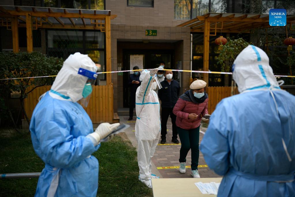Staff members conduct nucleic acid testing for residents of a residential compound locked down due to COVID-19 resurgence in Jinfeng District, Yinchuan, northwest China's Ningxia Hui Autonomous Region, Oct. 24, 2021. (Xinhua/Wang Peng)