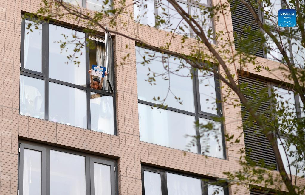 A little girl shows her painting to staff members at a residential compound locked down due to COVID-19 resurgence in Jinfeng District, Yinchuan, northwest China's Ningxia Hui Autonomous Region, Oct. 24, 2021. (Xinhua/Wang Peng)