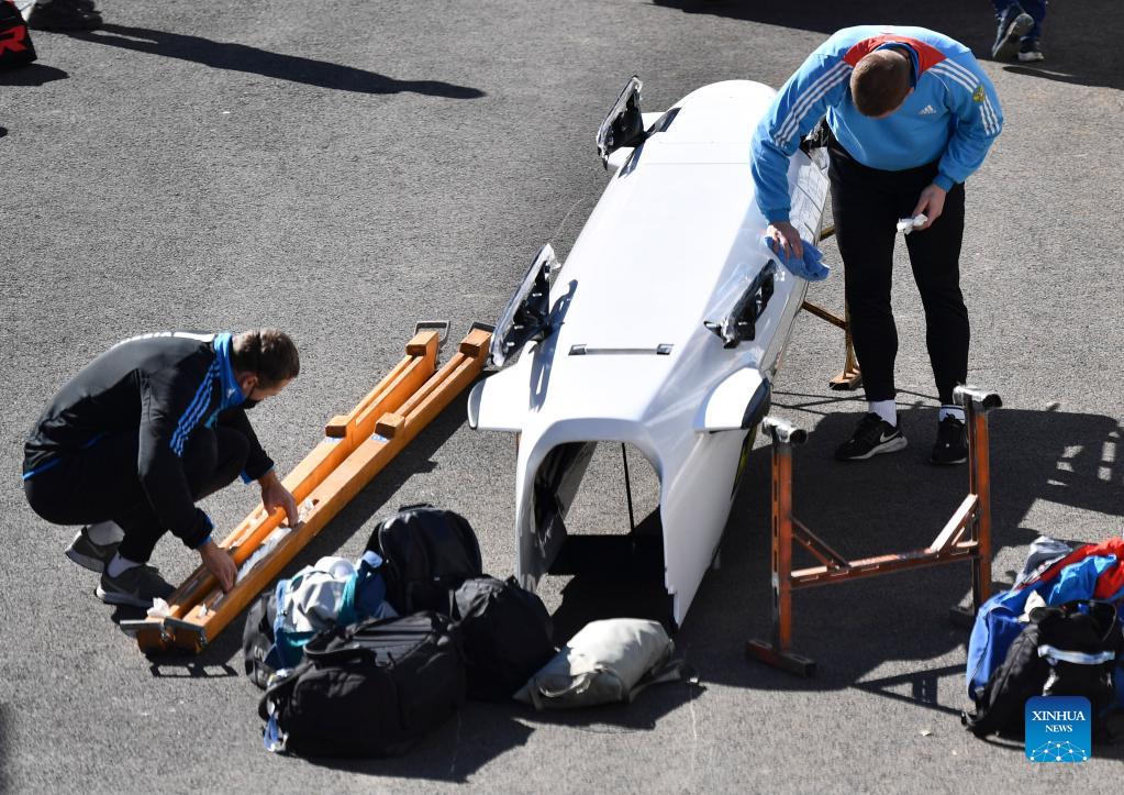 Athletes prepare for their competition of Bobsleigh during a test event for Beijing 2022 Olympic Winter Games at the National Sliding Center in Yanqing Zone, Beijing, capital of China, Oct. 26, 2021. (Xinhua/He Changshan)