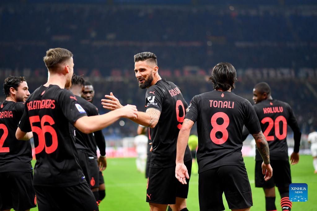 AC Milan's Olivier Giroud (3rd R) celebrates his goal with his teammates during a Serie A football match between AC Milan and Torino in Milan, Italy, on Oct. 26, 2021. (Str/Xinhua)