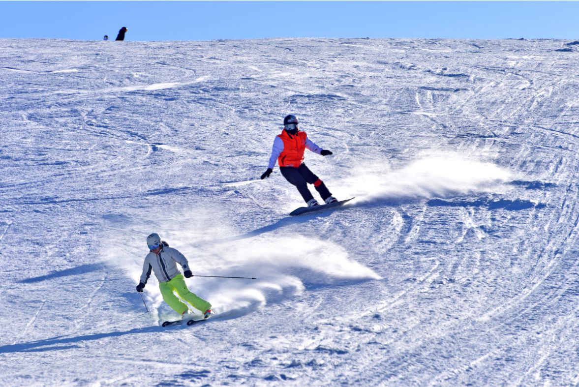 A skier and a snowboarder enjoy themselves on the slope at Jingyuan Yahao International Ski Resort in Jingyuan, Ningxia Hui autonomous region. [Photo provided to China Daily]