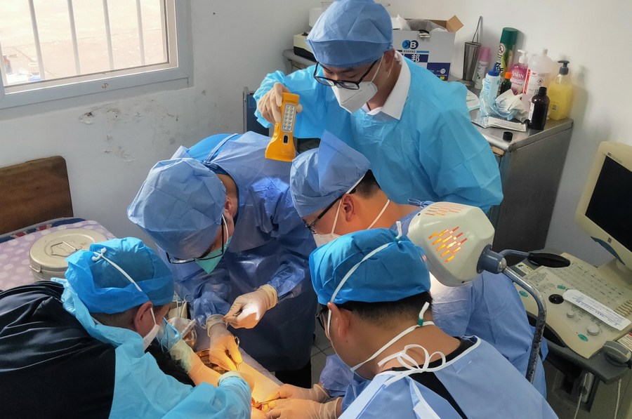 Members of a branch of the Chinese medical mission provide first aid to a victim injured in an explosion in Bata, Equatorial Guinea, March 7, 2021. (31st Chinese Medical Mission to Equatorial Guinea/Handout via Xinhua)