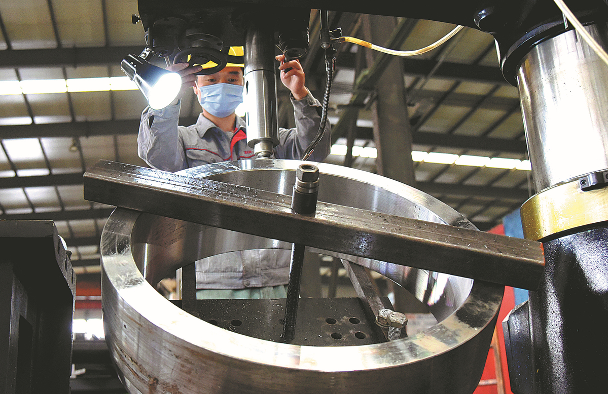 A technician works on the production line of textile machinery components at a plant in Lianyungang, Jiangsu province. [GENG YUHE/FOR CHINA DAILY]