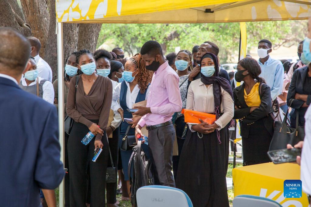 People attend a jobs and career expo at the University of Zambia in Lusaka, Zambia, on Oct. 27, 2021. The Confucius Institute at the University of Zambia (UNZA) on Wednesday held the fourth jobs and career expo where Chinese enterprises based in the southern African nation showcased themselves and tried to lure the local workforce, especially graduating students. (Photo by Martin Mbangweta/Xinhua)