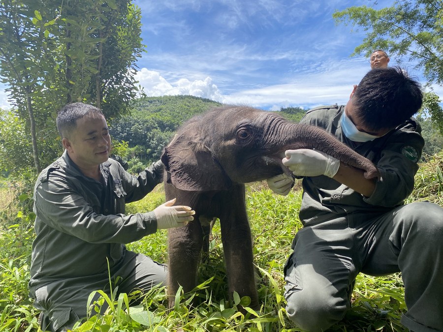 Rescuers feed a sick baby elephant abandoned by its herd in Xishuangbanna Dai Autonomous Prefecture, southwest China's Yunnan Province, Aug. 29, 2021. (Xishuangbanna Asian Elephant Breeding and Rescue Center/Handout via Xinhua)