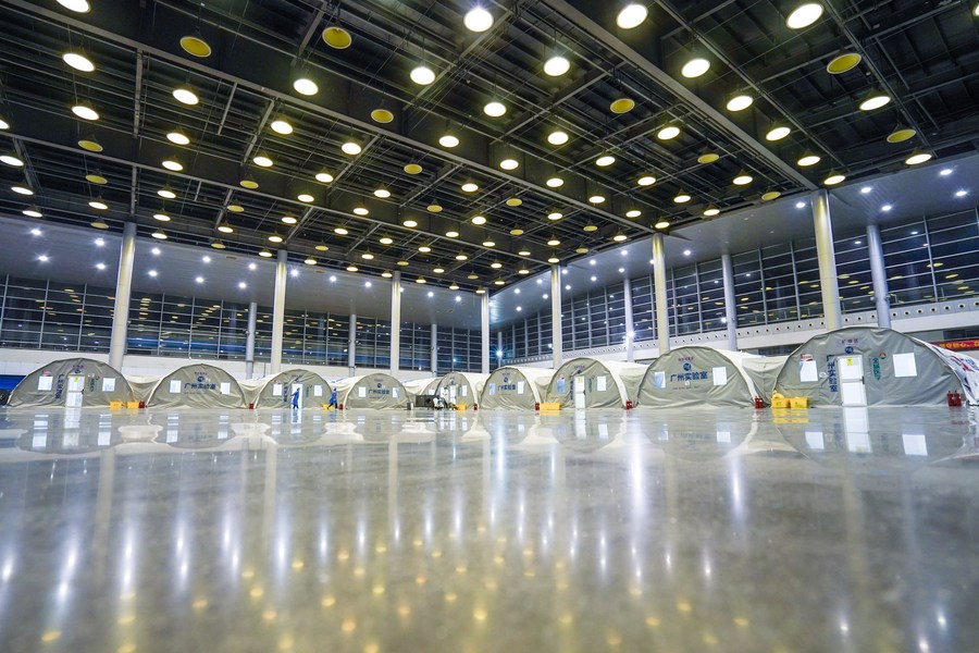 Photo taken on Aug. 14, 2021 shows "Falcon" air-inflated testing labs for COVID-19 nucleic acid testing at Yangzhou International Exhibition Center in Yangzhou, east China's Jiangsu Province. (Xinhua/Li Bo)