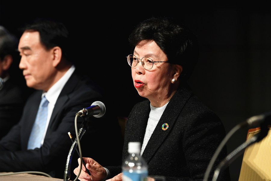 Margaret Chan Fung Fu-chun (R), former director-general of the World Health Organization (WHO), speaks at a promotion conference for the health forum in Tokyo, capital of Japan, on Jan. 22, 2019.(Xinhua/Hua Yi)