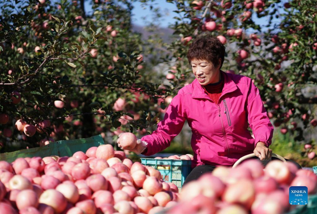 A grower sorts apples in an orchard in Gangdi Village of Neiqiu County in Xingtai City, north China's Hebei Province, Oct. 27, 2021. Local farmers started to harvest 3,500 mu (about 233 hectare) of apple recently. (Xinhua/Zhu Xudong)