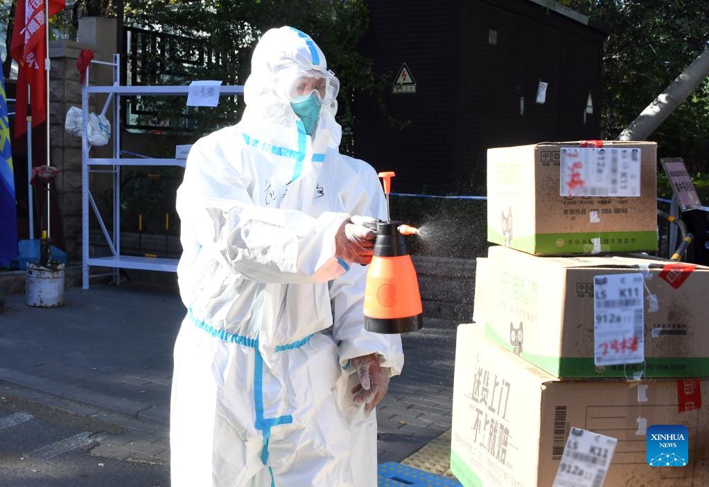 A staff member disinfects delivery packages at Furongli residential community in Haidian District of Beijing, capital of China, Oct. 27, 2021. Furongli has been put under closed-off management after one confirmed case of COVID-19 in the community on Oct. 24. Community workers and volunteers worked together to deliver daily necessities for residents during closed-off management. (Xinhua/Ren Chao)