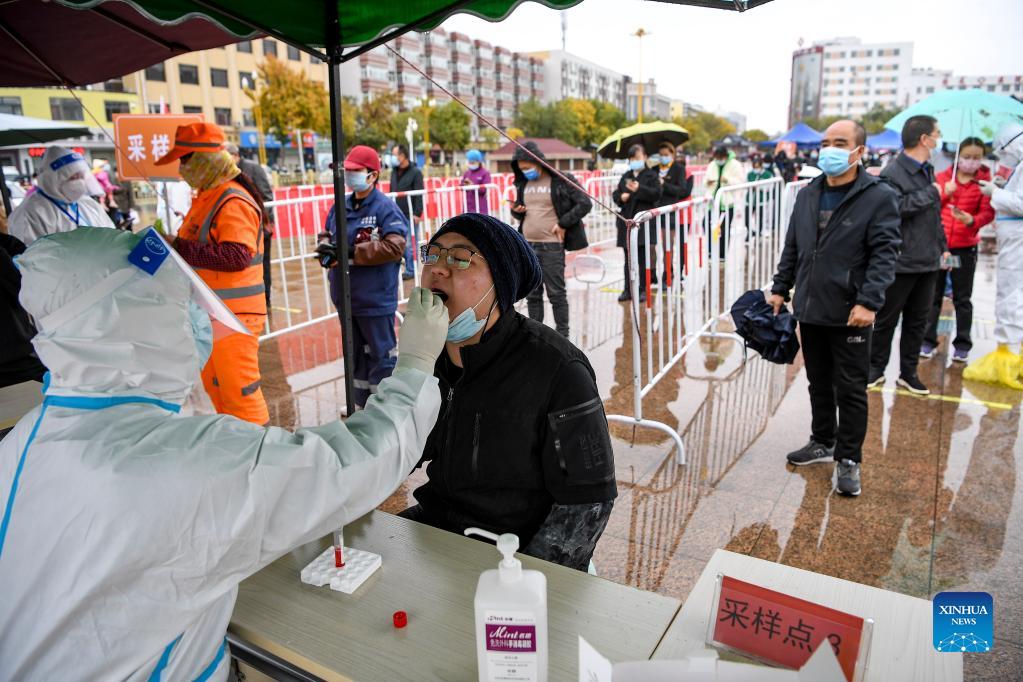 A medical worker takes a swab sample from a resident for nucleic acid testing at a sampling site in Yinchuan, northwest China's Ningxia Hui Autonomous Region, Oct. 27, 2021. Yinchuan launched a second round of all-inclusive nucleic acid testing on Wednesday since new confirmed COVID-19 cases were reported. (Xinhua/Feng Kaihua)