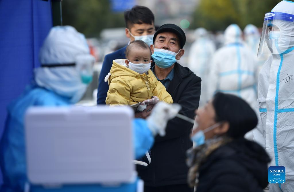 A medical worker takes a a swab sample from a citizen for nucleic acid testing in Xining, northwest China's Qinghai Province, Oct. 28, 2021. After Xining reported 3 new COVID-19 cases, local control of epidemic prevention has been strengthened. (Xinhua/Zhang Hongxiang)