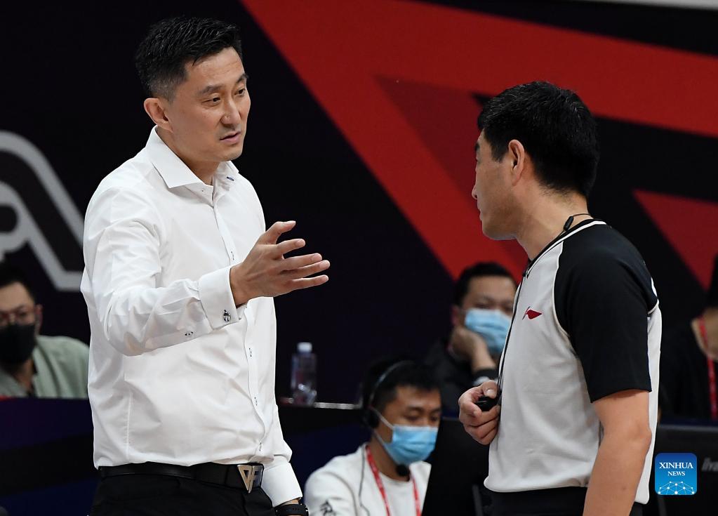 Head coach Du Feng (L) of Guangdong Southeast Tigers talks to the referee during the 6th round match between Guangdong Southeast Tigers and Shenzhen Aviators at the 2021-2022 season of the Chinese Basketball Association (CBA) league in Zhuji, east China's Zhejiang Province, Oct. 28, 2021. (Xinhua/Li An)