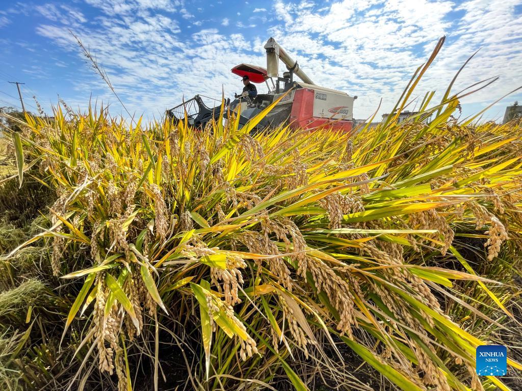Photo taken on Oct. 28, 2021 shows a reaper working in a field in Yujiaba Village of Shizong Township in Tongzhou District, Nantong City of east China's Jiangsu Province. (Xinhua/Li Bo)