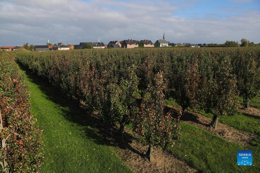 A Belaian conference pear orchard is seen in Sint-Gillis-Waas, Belgium, Oct. 22, 2021. At the upcoming 4th China International Import Expo (CIIE) to be held this November in Shanghai, Dole and BFV (Belgian Fruit Valley) will introduce a Belgian red conference pear to the Chinese and Asian market for the first time. This conference pear with dark red skin is a variety of the green conference pear which had sold well on the Chinese market for the past decade. (Xinhua/Zheng Huansong)