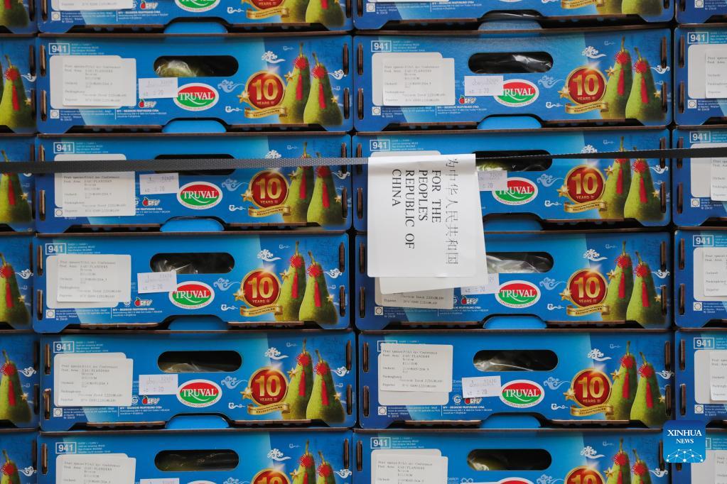 Belgian conference pears to be exported to China are seen at a facility of BFV (Belgian Fruit Valley) in Vrasene, Belgium, Oct. 22, 2021. At the upcoming 4th China International Import Expo (CIIE) to be held this November in Shanghai, Dole and BFV (Belgian Fruit Valley) will introduce a Belgian red conference pear to the Chinese and Asian market for the first time. This conference pear with dark red skin is a variety of the green conference pear which had sold well on the Chinese market for the past decade. (Xinhua/Zheng Huansong)