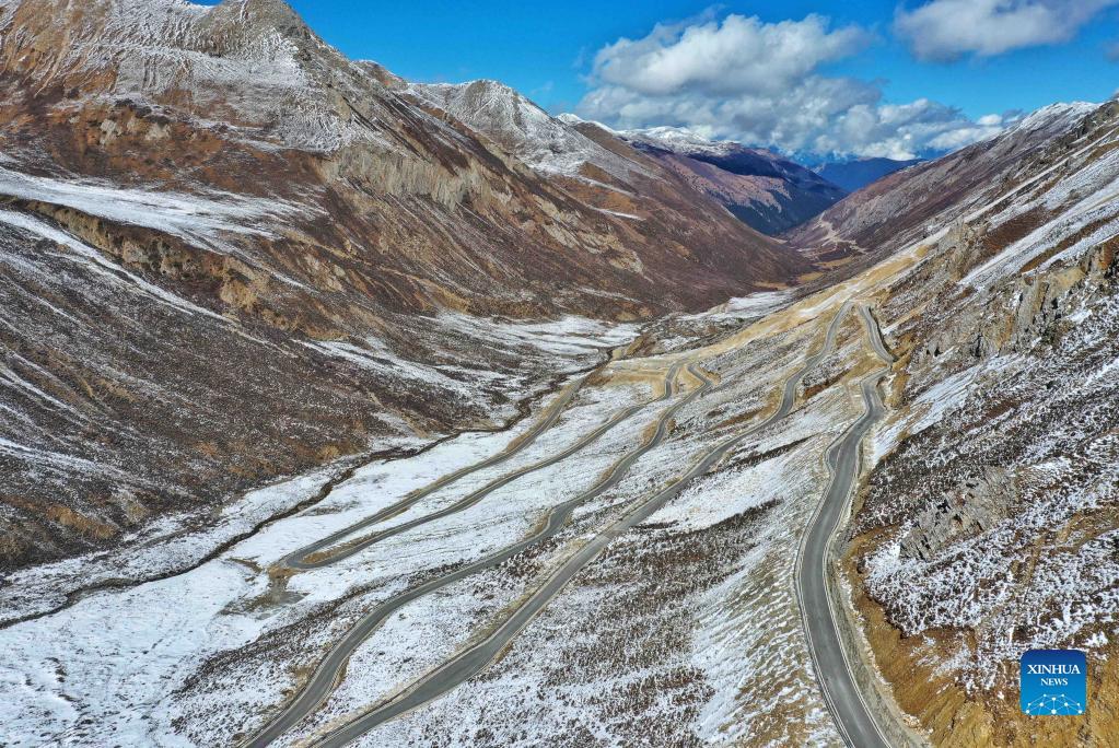 Aerial photo taken on Oct. 23, 2021 shows the winding road in Batang County, Tibetan Autonomous Prefecture of Garze, southwest China's Sichuan Province. (Xinhua/Liu Kun)