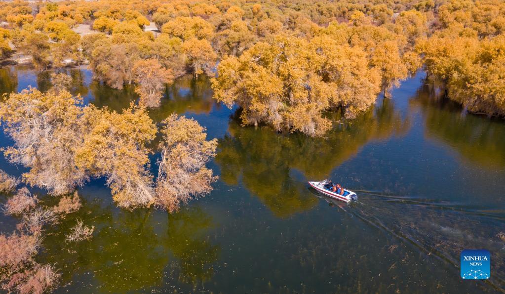 Aerial photo taken on Oct. 27, 2021 shows a view of Lop Nur National Wetland Park in Yuli County, Bayingolin Mongolian Autonomous Prefecture, northwest China's Xinjiang Uygur Autonomous Region. (Xinhua/Zhao Ge)