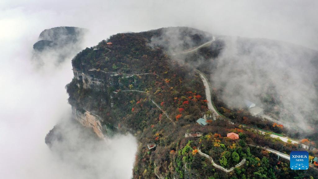 Aerial photo taken on Oct. 27, 2021 shows a view of Longtoushan scenic area in Hanzhong, northwest China's Shaanxi Province. (Xinhua/Tao Ming)