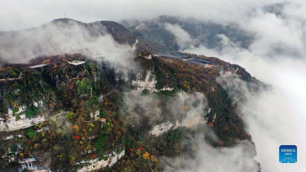 Aerial photo taken on Oct. 27, 2021 shows a view of Longtoushan scenic area in Hanzhong, northwest China's Shaanxi Province. (Xinhua/Tao Ming)