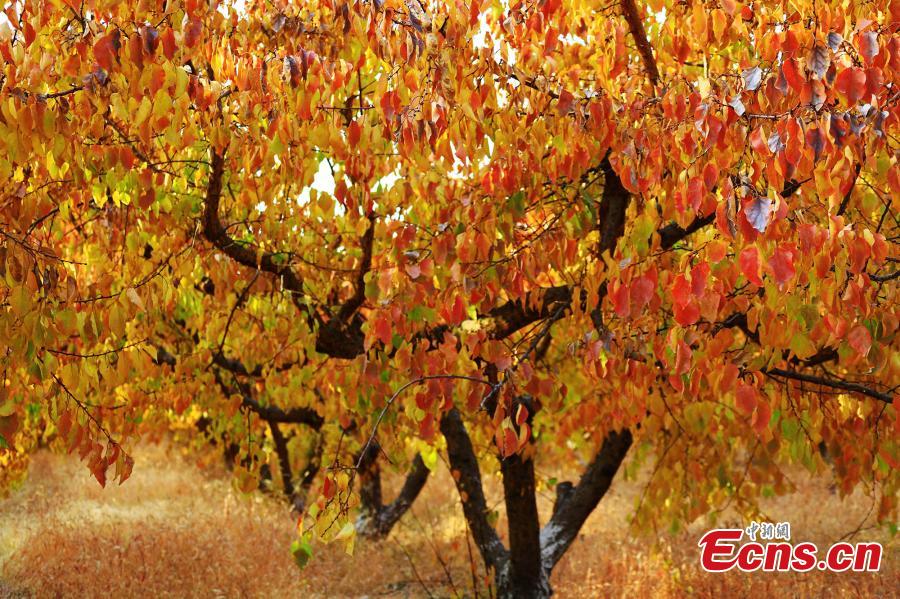 Apricot tree leaves change color during the late autumn in Nanhu Village, Xiazhen Town, Toksun County, Northwest China's Xinjiang Uygur Autonomous Region. (Photo: China News Service/Liu Yanmin)