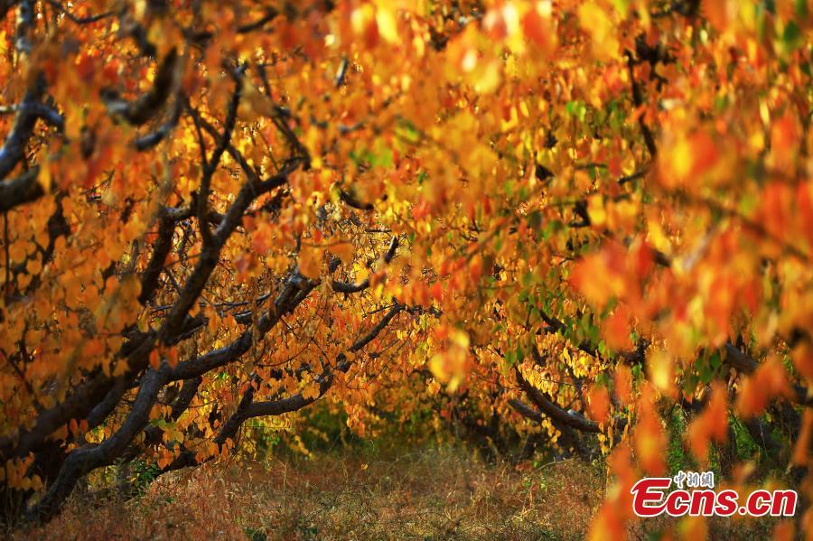 Apricot tree leaves change color during the late autumn in Nanhu Village, Xiazhen Town, Toksun County, Northwest China's Xinjiang Uygur Autonomous Region. (Photo: China News Service/Li Jinghai)