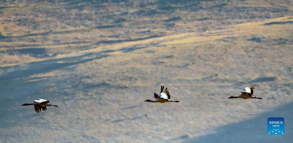 Black-necked cranes fly over the Napa Lake Nature Reserve in Shangri-la of Diqing Tibetan Autonomous Prefecture, southwest China's Yunnan Province, Oct. 29, 2021. More than 200 black-necked cranes have been spotted arriving at the Napa Lake Nature Reserve for wintering. (Xinhua/Jiang Wenyao)