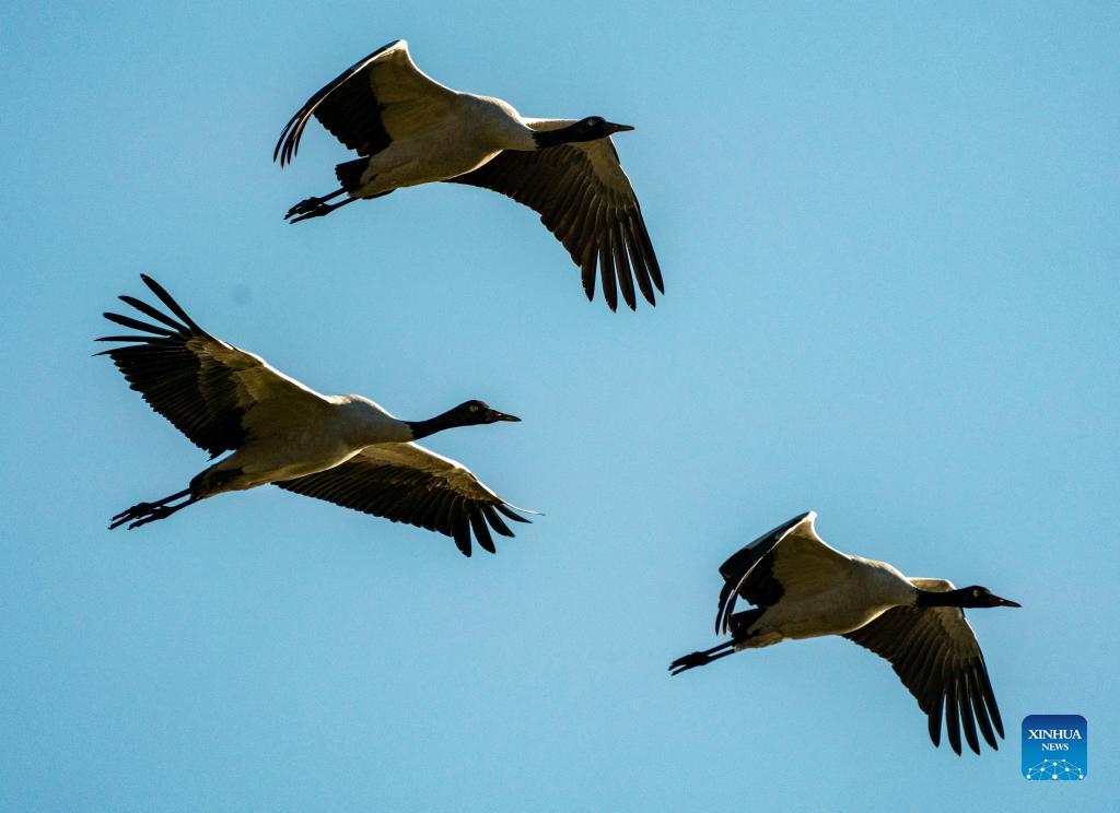 Black-necked cranes fly over the Napa Lake Nature Reserve in Shangri-la of Diqing Tibetan Autonomous Prefecture, southwest China's Yunnan Province, Oct. 29, 2021. More than 200 black-necked cranes have been spotted arriving at the Napa Lake Nature Reserve for wintering. (Xinhua/Jiang Wenyao)