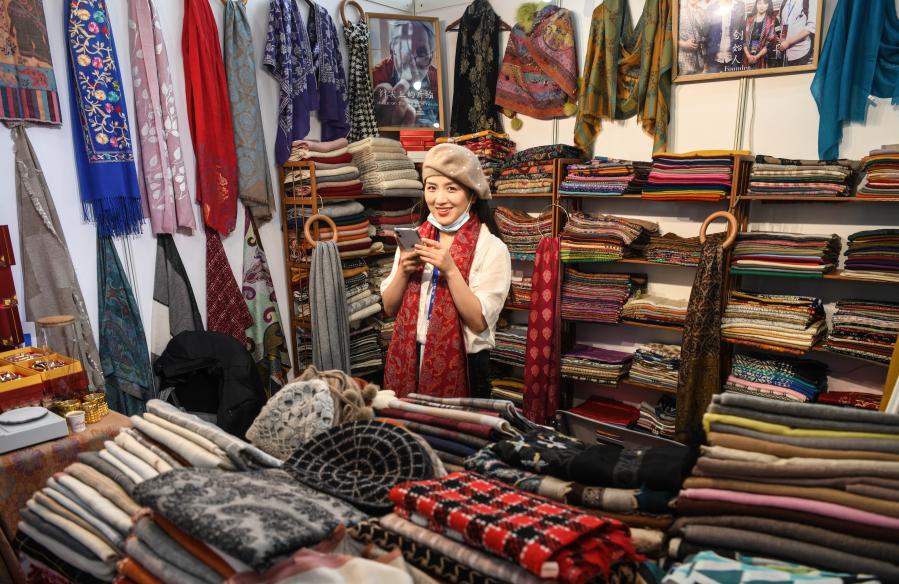 An exhibitor sells goods at the "Belt and Road" exhibition area of the 17th China-ASEAN Expo at Nanning International Convention and Exhibition Center in Nanning, south China's Guangxi Zhuang Autonomous Region, Nov. 27, 2020. (Xinhua/Zhang Ailin)