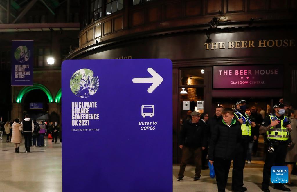 Passengers and police officers are seen at Glasgow Central train station in Glasgow, Scotland, the United Kingdom on Oct. 30, 2021. The 26th United Nations Climate Change Conference of the Parties (COP26) is scheduled from Oct. 31 to Nov. 12 in Glasgow, Scotland. This is the first of its kind since the Paris Agreement came into force. (Xinhua/Han Yan)