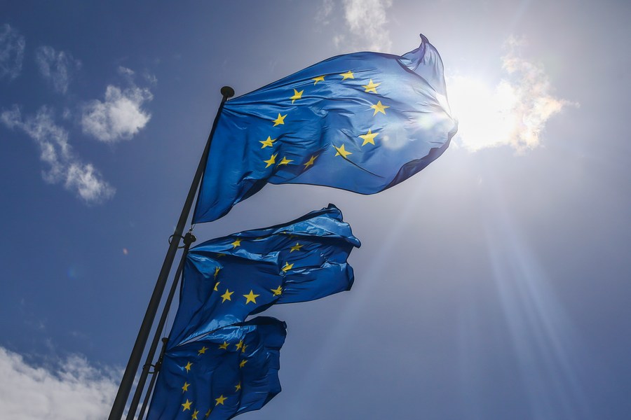 Flags of the European Union fly outside the EU headquarters in Brussels, Belgium, May 21, 2021. (Xinhua/Zheng Huansong)