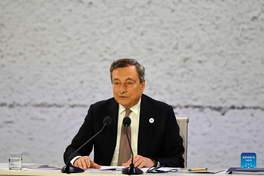 Italian Prime Minister Mario Draghi attends the closing press conference of the G20 Summit in Rome, Italy, on Oct. 31, 2021. The G20 Summit in Rome ended on Sunday with the adoption of a declaration reaffirming the crucial role of multilateralism and international cooperation in overcoming the global challenges arising from the COVID-19 pandemic. (Str/Xinhua)