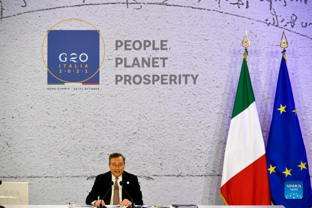 Italian Prime Minister Mario Draghi attends the closing press conference of the G20 Summit in Rome, Italy, on Oct. 31, 2021. The G20 Summit in Rome ended on Sunday with the adoption of a declaration reaffirming the crucial role of multilateralism and international cooperation in overcoming the global challenges arising from the COVID-19 pandemic. (Str/Xinhua)