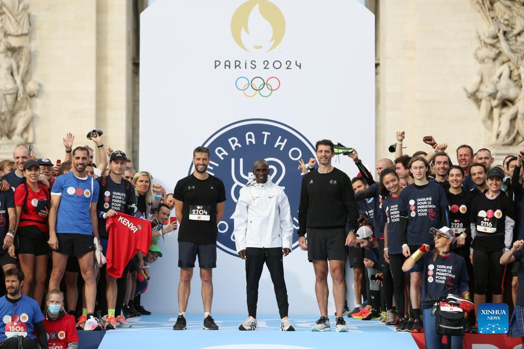 Kenya's Eliud Kipchoge (C) poses with participants after the J-1000 Paris 2024 Marathon Pour Tous or Marathon For All, a 5km run along the Champs-Elysees marking the 1000 days countdown to the opening of Paris 2024 Olympic Games, in Paris, France, Oct. 31, 2021. (Xinhua/Gao Jing)